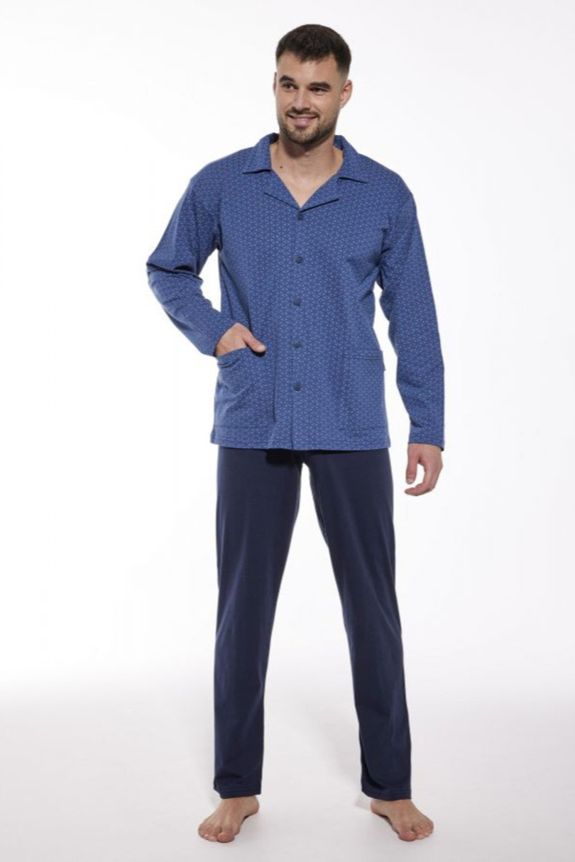 Klasické pánské pyžamo s dlouhými rukávy a límcem, otevřený límec, kapsy na úrovni boků, hladké kalhoty s rovnými dlouhými nohavicemi, pyžamo balené v krabici. Složení: 100% bavlna .
