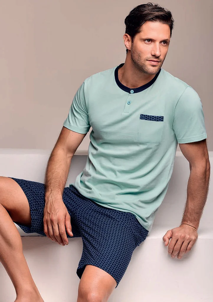 Stylové pánské pyžamo Infiore zaujme elegantní kombinací světle mentolové a tmavě modré. Tričko s krátkým rukávem má kontrastní lem výstřihu, zapínání na knoflíky a ozdobnou kapsičku s jemným vzorem, který ladí s kraťasy. Ty jsou vyrobené z lehkého materiálu a zdobeny drobným geometrickým potiskem. Pyžamo je ideální pro pohodlný spánek i domácí pohodu – díky kvalitní bavlně je příjemné na nošení a dobře drží tvar. Materiálové složení: 100% bavlna.