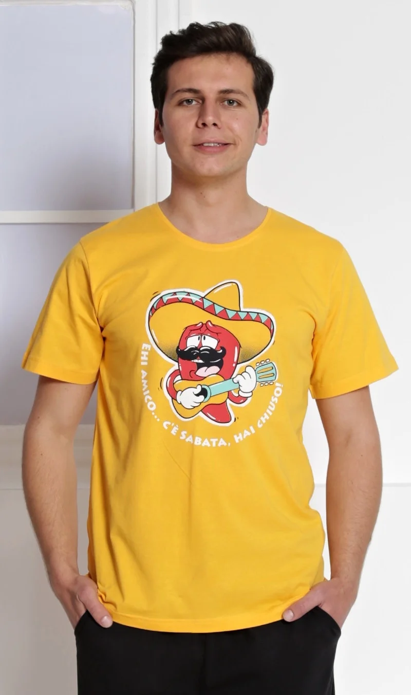 Pánské bavlněné kapri pyžamo Mexiko. Pánské pyžamo se skládá z trička s krátkým rukávem a tříčtvrtečních kalhot. Na jednobarevném tričku je obrázek chilli papričky s obrovským sombrérem, která hraje na kytaru. Tričko vhodně doplňují jednobarevné kalhoty pod kolena, které mají v pase gumu, šňůrku na stažení a praktické kapsy. Použitý materál s obsahem bavlny 100% je příjemný a poddajný na dotek. Pokyny pro údržbu: - 100% bavlna - lze prát v pračce při teplotě do 30° - nesušit v sušičce - žehlit z rubu do 110° - nepoužívat bělící prostředky - nečistit chemicky Velikost S M L XL obvod hrudníku 100 104 108 112 délka trika 71 73 75 77 pas 80-92 82-94 84-96 86-98 Při prvním praní je sráželviost materiálu 3%
