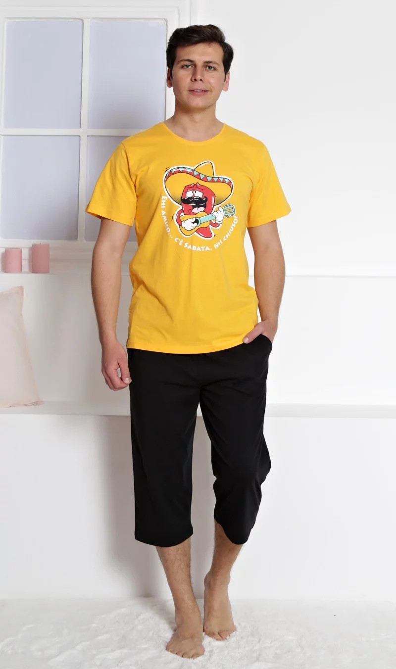 Pánské pyžamo kapri Mexiko. Pánské pyžamo kapri se skládá z trička s krátkým rukávem a tříčtvrtečních kalhot. Na jednobarevném tričku je chilli paprička s obrovským sombrérem a mexickým nápisem hrající na kytaru. Výrazné tričko vhodně doplňuují jednobarevné kalhoty. Použitý materiál je jemný a podddajný na dotek. Pyžamo je vhodné na denní nošení. Pokyny pro údržbu: - 100% bavlna - lze prát v pračce při teplotě do 30° - nesušit v sušičce - žehlit z rubu do 110° - nepoužívat bělící prostředky - nečistit chemicky Velikost S M L XL obvod hrudníku 100 104 108 112 délka trika 71 73 75 77 pas 80-92 82-94 84-96 86-98 Při prvním praní je sráželviost materiálu 3%
