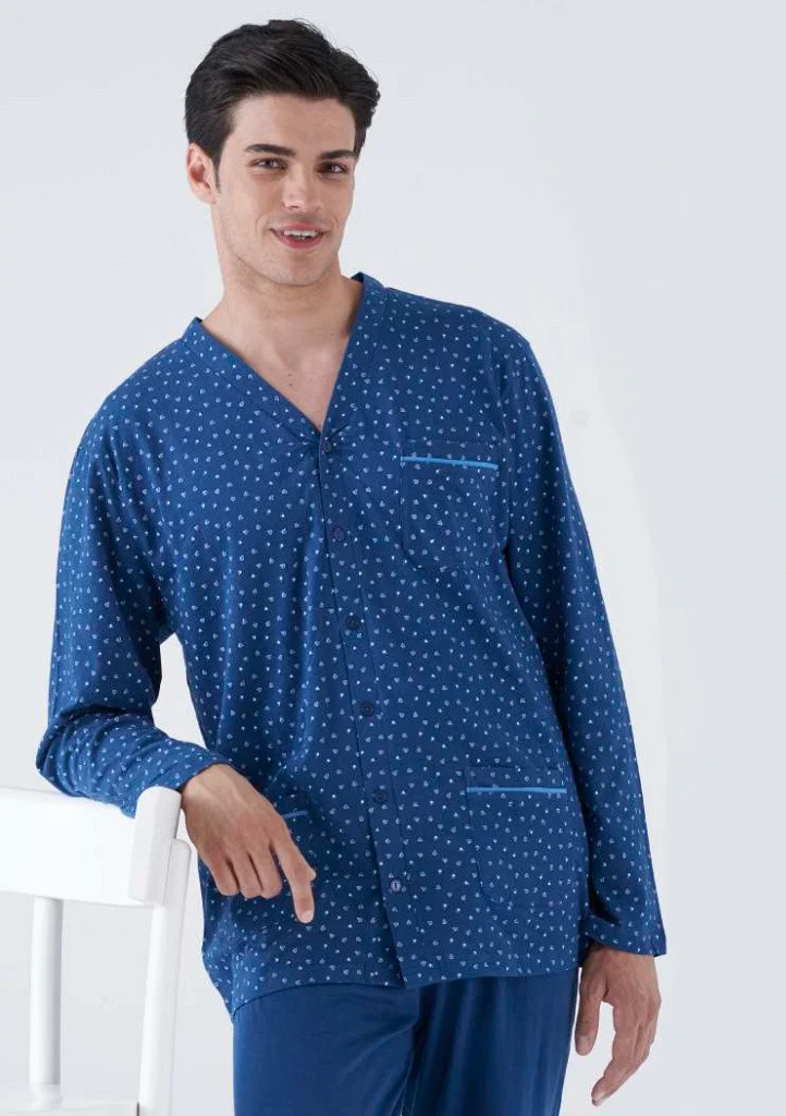 Pánské pyžamo značky Karelpiu. Pyžamo se skládá z kabátku, který je celopropínací na knoflíky, výstřih je do "V". Na levé straně je našitá kapsička a kapsičky jsou našité i ve spodní části. Kalhoty jsou v pase do pružné obšité gumy. Pyžamo nemá žádné lemy a je pohodlné na nošení, je ušité z příjemné bavlny. Materiálové složení: 100% bavlna