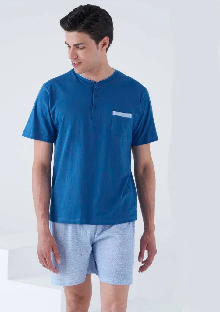Pánské bavlněné pyžamo italské značky Karelpiu. Pyžamo je ze 100% bavlny, velmi příjemné a pohodlné i v letních měsících. Tričko má krátký rukáv, kulatý výstřih a légu se třemi knoflíky. Na levé přední straně je našitá kapsička. Volné kraťasy mají v pase pohodlnou pružnou gumu. Materiálové složení: 100% bavlna.