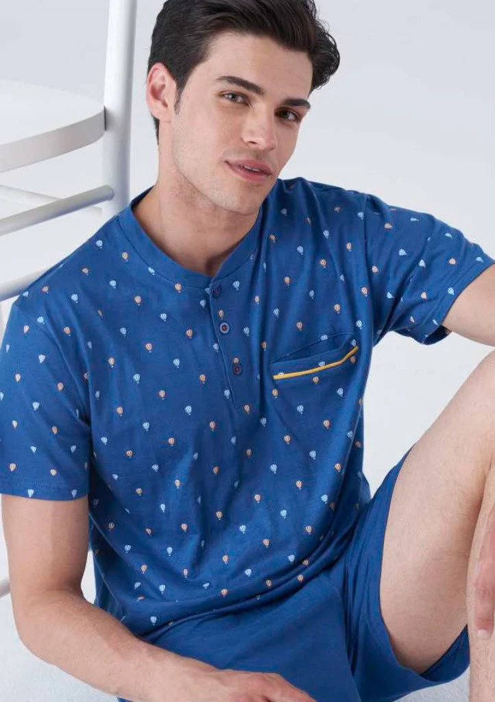 Pánské bavlněné pyžamo italské značky Karelpiu. Pyžamo je ze 100% bavlny, velmi příjemné a pohodlné i v letních měsících. Tričko má krátký rukáv, kulatý výstřih a légu se třemi knoflíky. Na levé přední straně je našitá kapsička. Volné kraťasy mají v pase pohodlnou pružnou gumu. Materiálové složení: 100% bavlna.