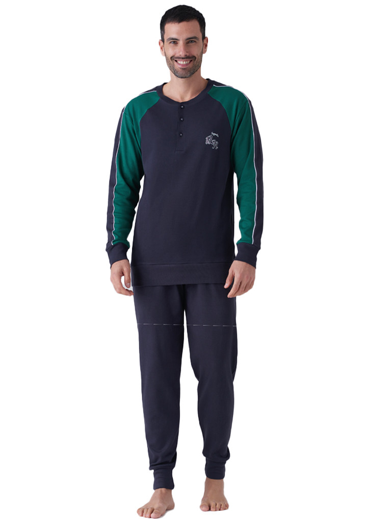 Pánské bavlněné pyžamo italské značky Karelpiu. Pyžamo je ze 100% bavlny, velmi příjemné a pohodlné. Tričko má dlouhý rukáv, kulatý výstřih a légu se třemi knoflíky. Na levé přední straně je menší nápis. Volné kalhoty mají v pase pohodlnou pružnou gumu, nohavice jsou ukončeny širokou mnažetou. Materiálové složení: 100% bavlna.