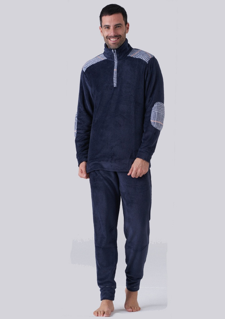 Pánské pyžamo značky Karelpiu. Pyžamo je hřejivé a pohodlné na nošení. Kabátek má stojáček na zip, rukávy jsou ukončené do manžety. Na ramenou a na loktech jsou našité barevné aplikace. Kalhoty jsou v pase do pohodlné obšité gumy, nohavice jsou ukončené do manžety. Materiálové složení: 100% polyester