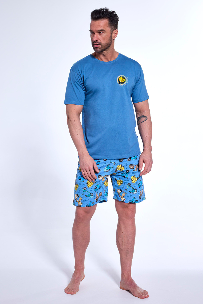 Męska piżama Way of Life KR 326/172 to doskonałe połączenie wygody i stylowego wyglądu. Wykonana w 100% z wysokogatunkowej bawełny, zapewnia maksymalny komfort i przewiewność, idealną na każdą noc. Koszulka z krótkim rękawem posiada półokrągły dekolt i subtelny nadruk na piersi, co nadaje jej nowoczesny, casualowy charakter. Krótkie, wzorzyste spodenki świetnie komponują się z gładką górą, a elastyczna gumka obszyta bawełną gwarantuje wygodne dopasowanie do sylwetki. To świetna opcja dla mężczyzn ceniących komfort i klasyczny styl.