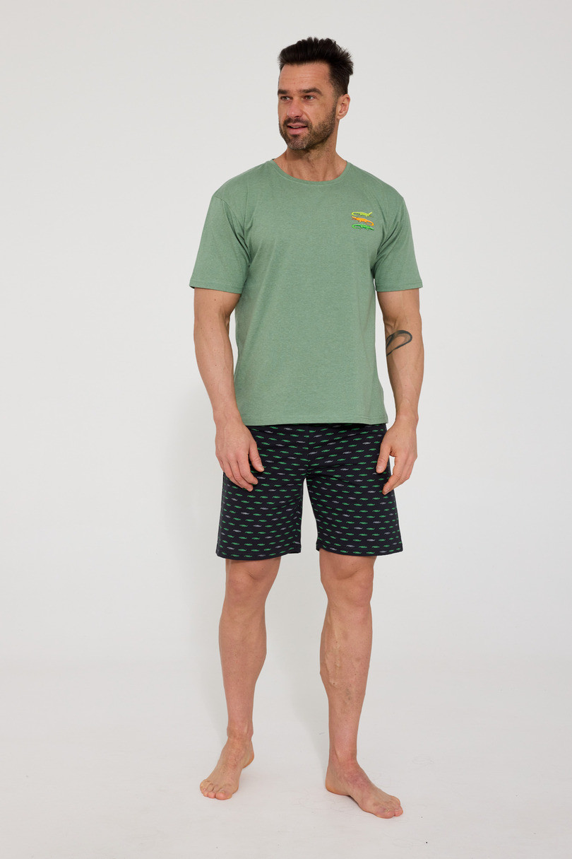 Pánské pyžamo KR 326/202 CROCODILES 2 je pohodlnou a stylovou nabídkou pro muže, kteří si cení pohodlí při spánku a ležérního, mladistvého designu. Vrchní část soupravy v podobě trička s krátkým rukávem je vyrobena z měkkého a na dotek příjemného bavlněného úpletu s přídavkem polyesteru, který zvyšuje jeho trvanlivost a odolnost proti častému praní. Půlkruhový výstřih zajišťuje volnost pohybu a malý barevný potisk s krokodýly na hrudi dodává pyžamu originalitu. Krátké vzorované šortky ze 100% přírodní bavlny zaručují prodyšnost a pohodlí i za teplejších nocí. Elastický pás lemovaný bavlnou se dokonale přizpůsobí siluetě bez pocitu tlaku. Pyžamo CROCODILES 2 je ideální volbou pro léto, domácí relaxaci a skvělým nápadem na praktický a stylový dárek. Složení: tričko 80 % bavlna, 20 % polyester, šortky 100 % bavlna