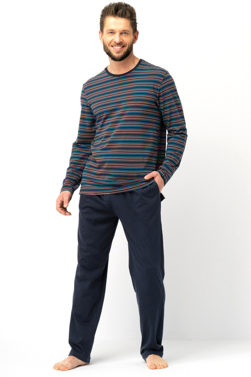 Piżama męska MNS 315 to połączenie komfortu i elegancji w domowym wydaniu. Górna część to miękka, przewiewna koszulka z długim rękawem, ozdobiona modnym, poziomym wzorem w paski w odcieniach granatu, bordo i błękitu. Luźny krój zapewnia swobodę ruchów, a miękki materiał delikatnie otula ciało. Spodnie w jednolitym granatowym kolorze, wykonane z przyjemnej w dotyku dzianiny, posiadają prostą nogawkę, dzięki czemu leżą wygodnie i nie krępują ruchów podczas snu. Całość doskonale sprawdzi się zarówno jako strój nocny, jak i wygodny ubiór domowy. 95% Bawełna, 5% Elastan