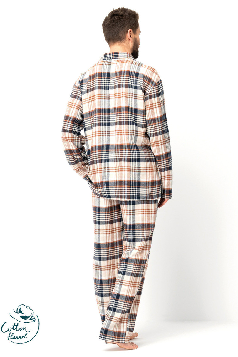 Męska piżama flanelowa MNS 443 to propozycja dla mężczyzn ceniących komfort i ponadczasowy styl. Wykonana z miękkiej, naturalnej bawełny flanelowej, zapewnia optymalne ciepło w chłodniejsze noce, jednocześnie pozostając przyjemna w dotyku i oddychająca. Góra w formie klasycznej koszuli zapinanej na guziki została wyposażona w elegancki kołnierzyk i kieszonkę na piersi. Spodnie z prostą nogawką i elastycznym pasem gwarantują swobodę ruchów oraz wygodne dopasowanie. Wzór w beżowo-granatową kratę nadaje całości elegancji i sprawia, że piżama jest idealna nie tylko do spania, ale i porannego relaksu w domowym zaciszu. Skład: 100% Bawełna Flanela