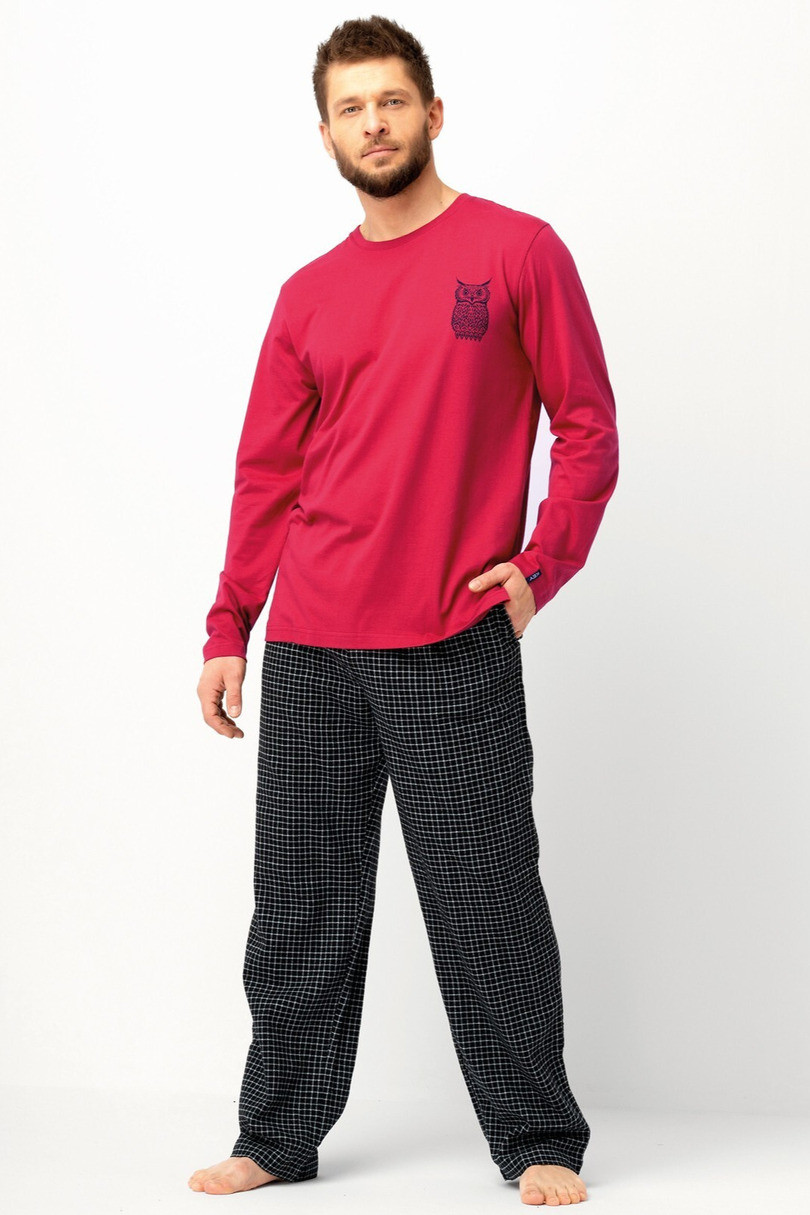 Pánský pyžamový komplet MNS 471 B25 je pohodlná souprava vyrobená výhradně z přírodní, prodyšné bavlny. Blůza s dlouhými rukávy a kulatým výstřihem byla ozdobena zajímavým potiskem soviček, který dodává celému kompletu jedinečný charakter. Kalhoty z měkkého flanelu v klasickém kostkovaném vzoru vynikají rovně střiženými nohavicemi a praktickými bočními kapsami. Elastický pas lemovaný bavlnou zajišťuje pohodlné nošení a volnost pohybu. Jedná se o ideální volbu pro muže, kteří na svém každodenním domácím oblečení ocení přírodní materiály, praktičnost a zároveň nádech originality..