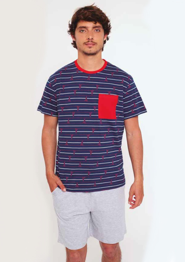 Pánské bavlněné pyžamo od značky Muydemi. Pyžamo je ze 100% bavlny, velmi příjemné a pohodlné i v letních měsících. Tričko má krátký rukáv, kulatý výstřih. Na levé přední straně je našitá kapsička. Volné kraťasy mají v pase pohodlnou pružnou gumu. Materiálové složení: 100% bavlna.