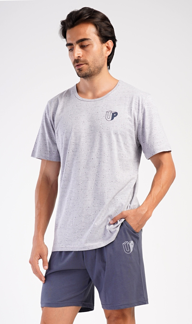 Pánské bavlněné šortkové pyžamo Pedro. Pánské pyžamo se skládá z trička s krátkým rukávem a krátkých šortkových kalhot. Tričko je zdobené nepravidelnými proužky a nápisem 'UP'. Drobný nápis najdete i na jednobarevných šortkách, které mají v pase gumu, šňůrku na stažení a praktické kapsy. Použitý materiál s obsahem bavlny 100% je poddajný a příjemný na dotek. Pokyny pro údržbu: - 100% bavlna - lze prát v pračce při teplotě do 30° - nesušit v sušičce - žehlit z rubu do 110° - nepoužívat bělící prostředky - nečistit chemicky Míry naměřené na výrobku: 4051473895 Pedro M L XL XXL obvod hrudníku 106 110 114 118 délka trika 72 73 75 78 pas 80-92 82-94 88-100 90-102 délka šortek 45 47 49 50