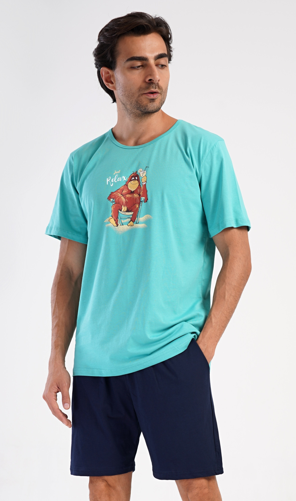 Pánské bavlněné šortkové pyžamo Relax. Pánské pyžamo se skládá z trička s krátkým rukávem a krátkých šortkových kalhot. Na jednobarevném tričku je obrázek opičáka, který relaxuje na pláži s drinkem. Šortky mají praktické kapsy, v pase gumu a šňůrku na stáhnutí. Použitý materiál s podílem bavlny 100% je příjemný a poddaný na dotek. Pyžamo je vhodné i na denní nošení a oceníte ho obzvlášť v horkých letních dnech. Pokyny pro údržbu: - 100% bavlna- lze prát v pračce při teplotě do 30°- nesušit v sušičce- žehlit z rubu do 110°- nepoužívat bělící prostředky- nečistit chemicky 4084290000 Relax M L XL XXL obvod hrudníku 104 106 112 114 délka trika 70 73 76 76 pas 78-90 80-92 82-94 86-98