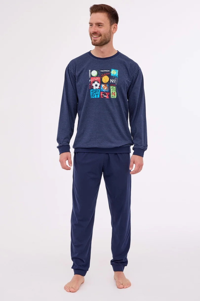 Pánské pyžamo z kvalitní měkké bavlny. pruhované tričko s dlouhými rukávy. dlouhé jednobarevné kalhoty. výstřih, manžety a spodní část trička s nohavicemi zakončené pohodlnou šňůrkou. pyžamo balené v krabici. Složení: 80% bavlna, 20% polyester .