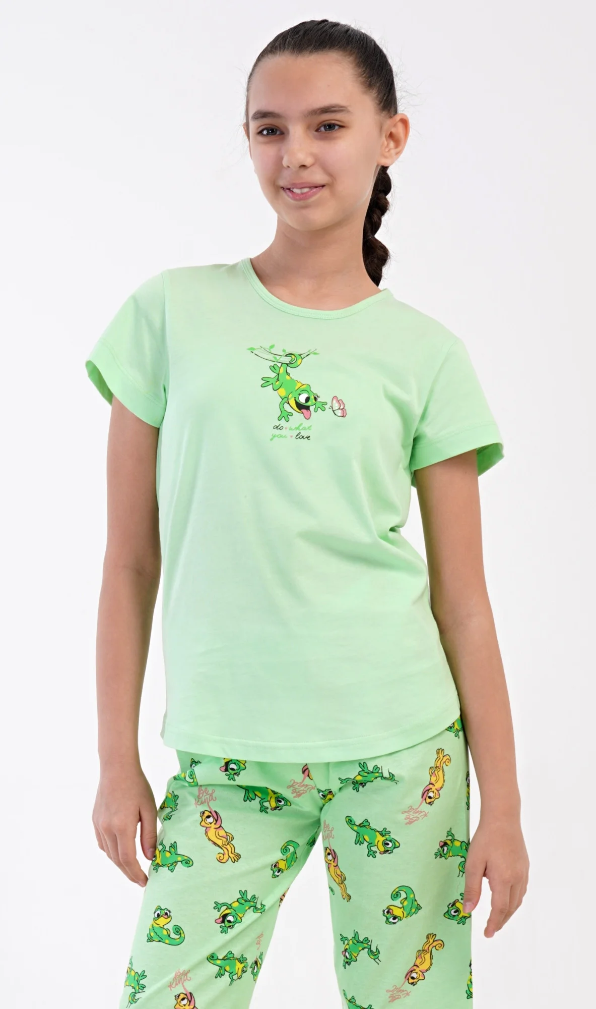 Dětské bavlněné pyžamo kapri Ella. Dětské pyžamo se skládá z trička s krátkým rukávem a tříčtvrtečních kalhot. Na jednobarevném tričku je obrázek veselé ještěrky. Tento motiv se opakuje i na kalhotách, které mají délku pod kolena. Použitý bavlněný materiál je příjemný a poddajný na dotek. Pokyny pro údržbu: - 100% bavlna- lze prát v pračce při teplotě do 30°- nesušit v sušičce- žehlit z rubu do 110°- nepoužívat bělící prostředky- nečistit chemicky Míry naměřené na výrobku: 4082826820 Ella 7-8 9-10 11-12 13-14 obvod hrudníku 72 76 80 84 délka trika 53 54 55 56 pas 56-68 58-70 60-72 66-78