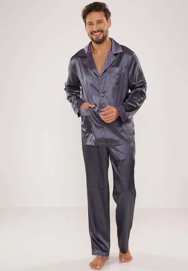 Pánské saténové pyžamo. Blůza pyžama má límec, kapsy a rozepíná se. Dlouhé jednobarevné kalhoty mají na bocích dvě kapsy. Manžety, límec a kapsy jsou ozdobené vzorovaným materiálem. Složení: 97 % polyester, 3 % elastan.