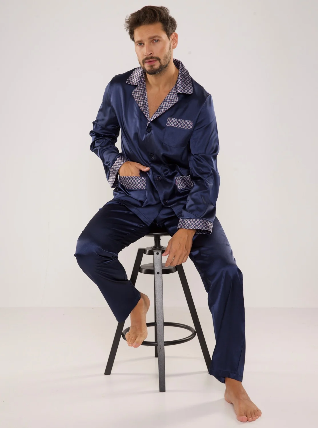 Pánské saténové pyžamo. Blůza pyžama má límec, kapsy a rozepíná se. Dlouhé jednobarevné kalhoty mají na bocích dvě kapsy. Manžety, límec a kapsy jsou ozdobené vzorovaným materiálem. Složení: 97 % polyester, 3 % elastan.