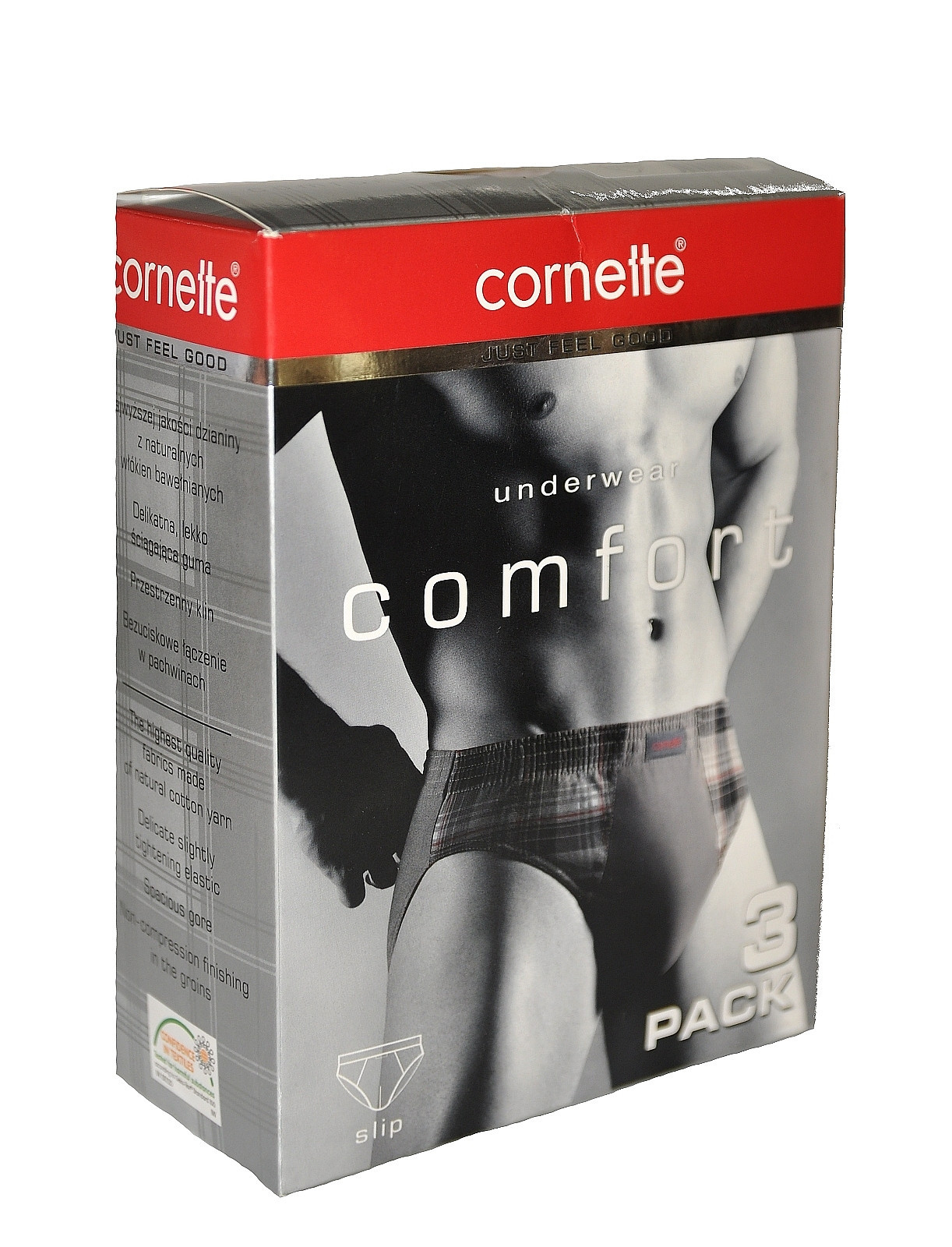 Pánské slipy, které jsou vyrobené z velmi kvalitní bavlny. Na bocích modelu jsou kárované vsadky v kontrastní barvě. V pase je pohodlná guma, která při nošení netlačí. Slipy jsou balené v krabičce po třech kusech.