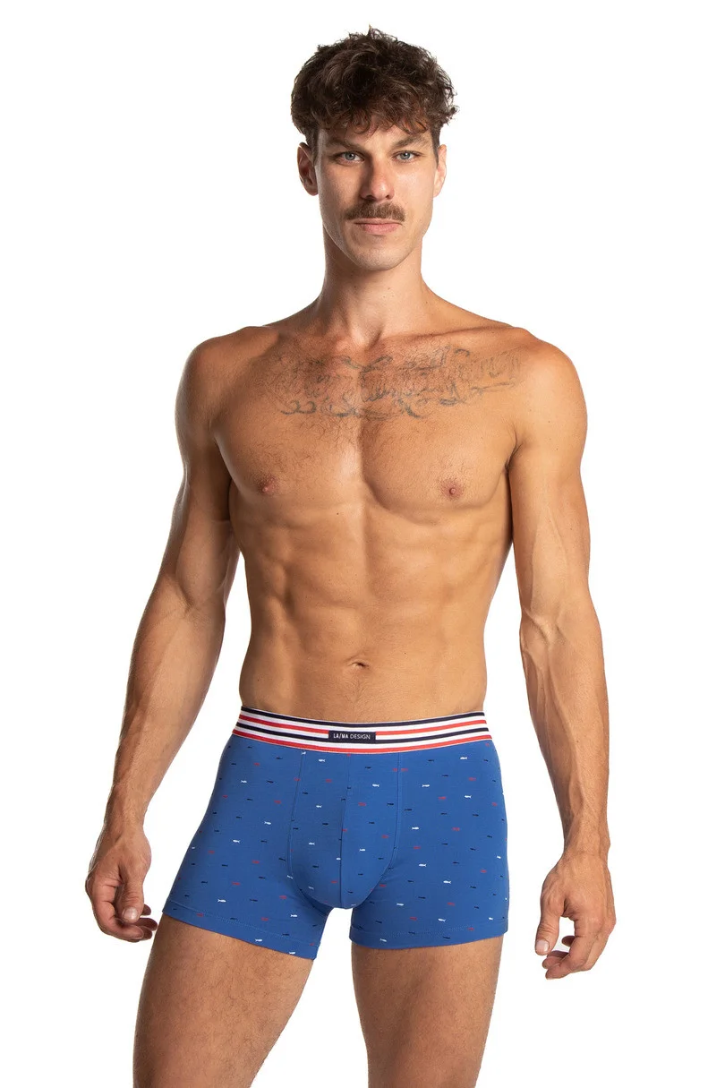 LAMA M-1066 to męskie bokserki, które łączą klasykę z nowoczesnym, sportowym wyglądem. Wykonane z wysokiej jakości dzianiny – 95% bawełny i 5% elastanu – zapewniają znakomitą elastyczność, przewiewność i trwałość. Materiał idealnie dopasowuje się do sylwetki, a płaskie szwy eliminują ryzyko podrażnień. Wyrazisty pas z logo „LAMA DESIGN” i trójkolorowym wykończeniem dodaje bieliźnie charakteru. Elastyczny pas utrzymuje bokserki na właściwym miejscu bez ucisku, zapewniając komfort przez cały dzień – zarówno w pracy, jak i podczas aktywności fizycznej.