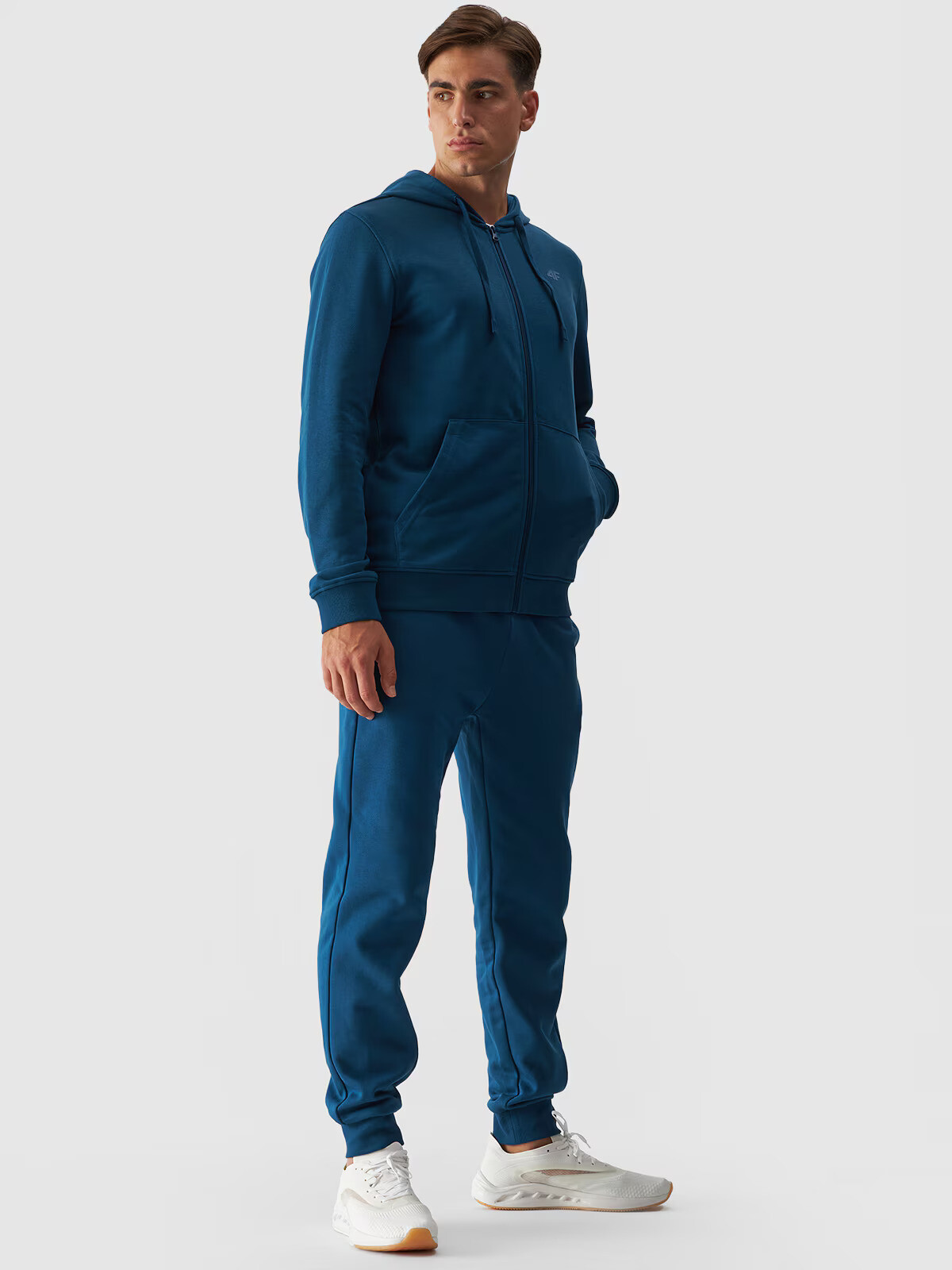Pánské tepláky typu jogger jsou ideálním prvkem jak pro casualové, tak sportovní každodenní stylizace. Mají střih regular, který se pohodlně přizpůsobí postavě a zúžené nohavice zakončené elastickým lemem. Tepláková pletenina french terry je z jedné strany hladká, zatímco na druhé straně je viditelná smyčková vazba. Pletenina v této vazbě je měkká, splývavější a tenčí na dotek. Pánské tepláky 4F jsou vyrobeny z pleteniny se střední gramáží 300 gsm, díky čemuž jsou měkké a prodyšnější. Pánské tepláky jsou vyrobeny z 80% bavlny, díky čemuž jsou měkké, odolné a příjemné na dotek. Díky přídavku polyesteru (20%) si materiál zachovává svůj střih a je odolný vůči opotřebení i po mnoho sezón. Kalhoty jsou bez podšívky, díky čemuž jsou lehčí a vhodné pro teplejší dny. Na bocích jsou 2 otevřené kapsy. Elastický pás s vnitřním nastavením na šňůrky.