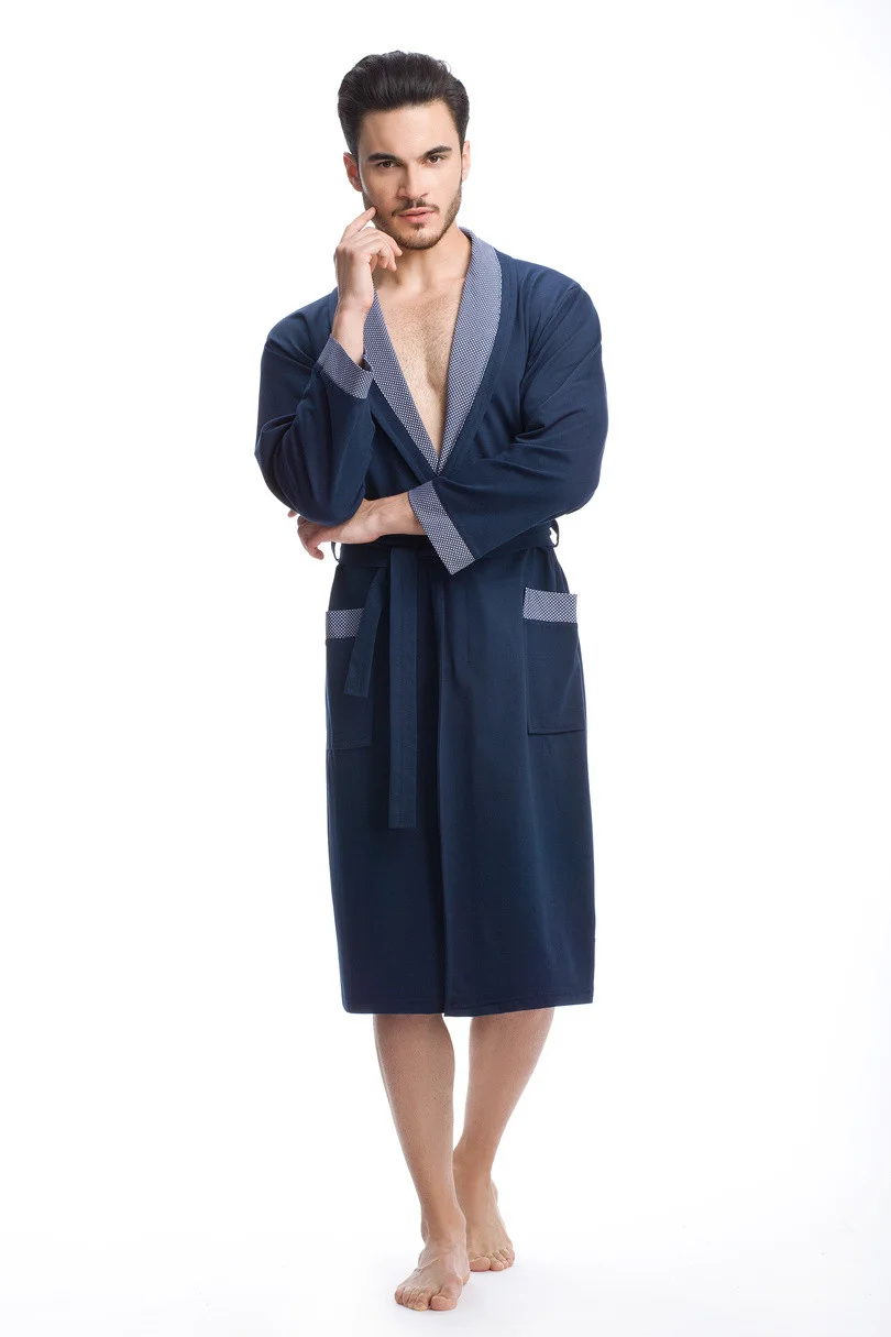 Pohodlný pánský župan, zavazování v pase, límec a kapsy zakončené kontrastní látkou. Složení: 100% bavlna .