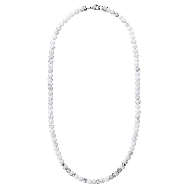 Tento pánský náhrdelník z matného bílého howlitu s jemným šedým žilkováním je ztělesněním čistého, uvolněného stylu. Korálky o průměru 6 mm vytvářejí vyváženou linii, kterou doplňují drobné prvky z chirurgické oceli v různých tvarech – od hladkých po dekorativně strukturované. Výsledkem je doplněk, který je výrazný, a přitom jemný, vhodný jak pro volný čas, tak i do minimalistického elegantního stylingu.Náhrdelník působí ležérně, přirozeně a zároveň moderně. Bílý howlit je velmi oblíbeným minerálem ve šperkařství, a jeho světlý tón se skvěle kombinuje se zlatem, ocelí i denimem. Stylově jej využijí muži, kteří sledují módní trendy, ale zároveň vyznávají jednoduchost, přírodní materiály a promyšlené detaily. 💡 Tip: ento náhrdelník vynikne především na opálené pokožce nebo ve spojení se světlými látkami – ideální k bílé košili, světle modrému denimu nebo lněnému saku.