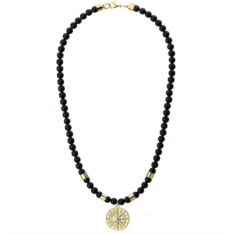Pánský korálkový náhrdelník Diego Gold - přírodní onyx, větrná růžice, Zlatá 60 cm