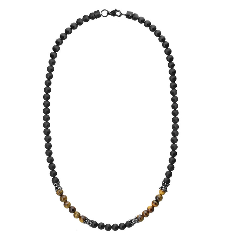 Ozdobte svůj krk tímto exkluzivním pánským náhrdelníkem z kolekce značky Manoki. Nese název Domenico a je složený z černých 6 mm matných onyxů a leštěného Tygřího oka. Náhrdelníku dodávají šmrnc ocelové vintage korálky. K náhrdelníku nabízíme i náramek ze stejné kolekce. Náhrdelníky s korálky z přírodních kamenů jsou nesporným MUST HAVE hitem této sezóny, který musí být v šatníku každého znalce módy. Délka náhrdelníku je 47 cm. Náhrdelník je skvělým doplňkem ke každodennímu outfitu pro muže, kteří mají rádi originální a designové doplňky. Noste jej samostatně nebo si vytvořte vlastní kompozici s dalšími korálkovými, koženými či ocelovými náhrdelníky. Vypadá opravdu skvěle, když se nosí s jinými náhrdelníky jako vrstvený náhrdelník. Náhrdelník dá šmrnc každému stylu: jak kanceláře, na procházku tak i na večer. Onyx - přírodní polodrahokam je ochranným kamenem proti kletbám a negativní energii. Odstraňuje negativní emoce z těla, chrání před zlem, čistí mysl, dodává vytrvalost a odvahu. Onyx pochází z řečtiny a znamená „dráp“. Onyx je kamenem válečníků a neúnavných cestovatelů. Tento minerál má obrovskou moc a majitel onyxových šperků se stává pánem svého osudu, dokáže ovládat své emoce a neúnavně se snaží dosáhnout svých cílů. Tygří oko - ochranný amulet, talismam štěstí a úspěchu. Od pradávna bylo Tygří oko amuletem válečníků, bylo určeno k ochraně válečníků před zraněním v bitvě. Dnes je tygří oko amuletem pro začínající obchodníky, lidi, kteří potřebují finanční stabilitu, a ty, kteří chtějí v životě uspět. Stydliví lidé, kteří nosí šperky s tygřím okem, mají získat sebevědomí, mají mít více odvahy při veřejném vystupování a účinně se zbavit emočních blokád. Minerál má od pesimistů zahánět negativní myšlenky, pochybnosti a zmatek. Jeho úkolem je pomoci vám, abyste se v životě cítili šťastní. Tygří oko má také schopnost rozptýlit úzkost a strach nebo utišit vznikající depresivní stavy.