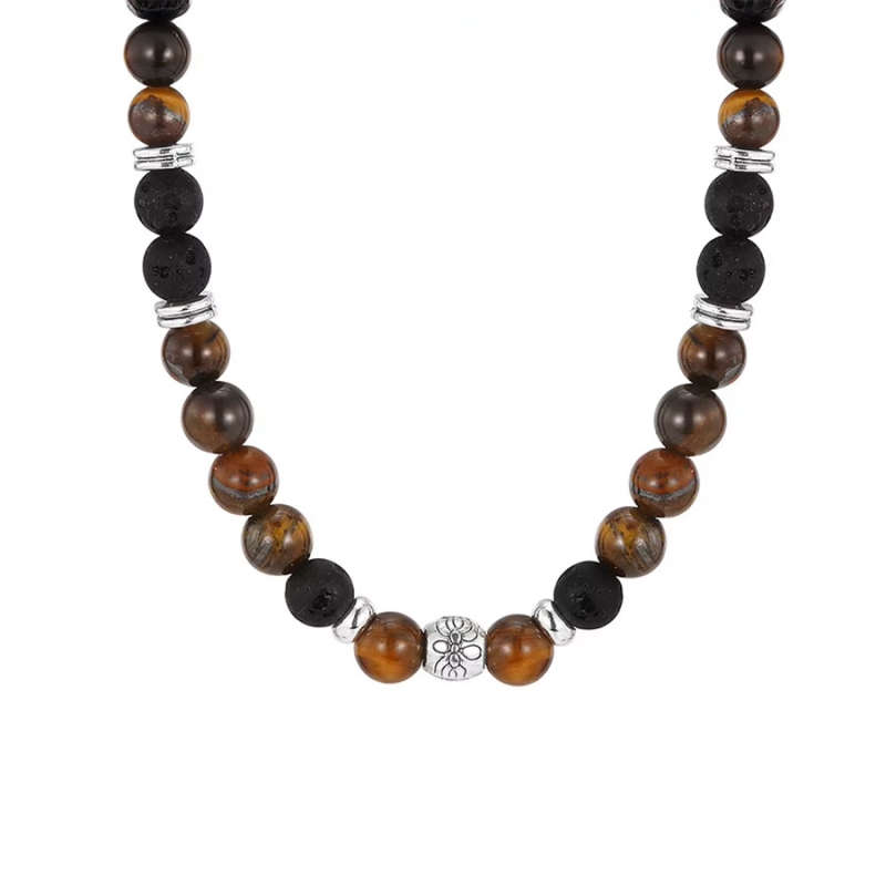 Pánský náhrdelník s korálky z tygřího oka a lávového kamene je elegantním a přitom výrazným doplňkem, který zaujme na první pohled. Přírodní hnědozlaté odstíny tygřího oka v kontrastu s matnou černí lávového kamene vytvářejí jedinečnou kombinaci, která podtrhne váš osobitý styl.Šperk je doplněn o decentní kovové prvky, které zvýrazňují celkový design a dodávají mu moderní nádech. Díky univerzálním barvám je náhrdelník vhodný jak ke každodenním outfitům, tak i k elegantnějším příležitostem. Pohodlné zapínání zajišťuje snadné nošení po celý den.Tento náhrdelník není jen módním doplňkem, ale také symbolem síly a energie. Tygří oko je známé jako kámen odvahy a ochrany, zatímco lávový kámen symbolizuje uzemnění a vnitřní klid. Dopřejte si šperk, který v sobě nese styl i smysl. 💡Tip: Náhrdelník doporučujeme kombinovat s pánským koženým náramkem nebo korálkovým náramkem ve stejných tónech pro dokonalý a sladěný vzhled.