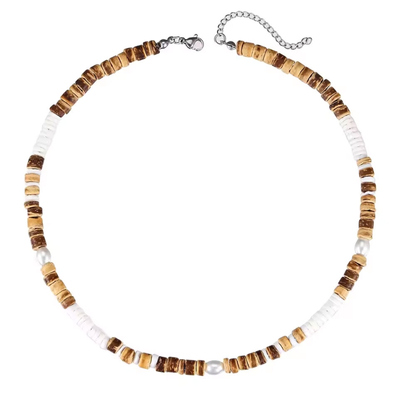 Tento pánský korálkový náhrdelník zaujme originálním spojením kokosových odstínů, bílé barvy a perleťových detailů. Kombinace světlých a tmavších korálků vytváří harmonický přechod tónů, který působí elegantně, ale stále přirozeně a neformálně. Dva perlové akcenty dodávají náhrdelníku nádech luxusu, aniž by narušovaly jeho uvolněný charakter.Tento styl náhrdelníků pochází z havajské kultury a byl populární zejména v 70. letech, ale také během 90. let a znovu se vrací do módy jako retro doplněk. Původně sloužil jako amulet pro surfaře a milovníky moře – symbolizoval klid, rovnováhu a vztah k přírodě. Moderní design tohoto šperku si zachovává svou symboliku, ale zároveň odpovídá současným módním trendům.Náhrdelník je vybaven klasickým zapínáním s prodlužovacím řetízkem, takže si ho snadno přizpůsobíte. Hodí se k bílým, béžovým a zemitým tónům, ať už k letnímu tričku, košili nebo neformálnímu plážovému outfitu. Je to ideální doplněk pro muže, kteří chtějí propojit přírodní eleganci s lehkým retro nádechem. 💡Tip: Zkuste ho kombinovat s krémovou lněnou košilí, plátěnými kraťasy a jednoduchým náramkem z přírodních materiálů. Vznikne tak ucelený letní look s atmosférou tropického ostrova.