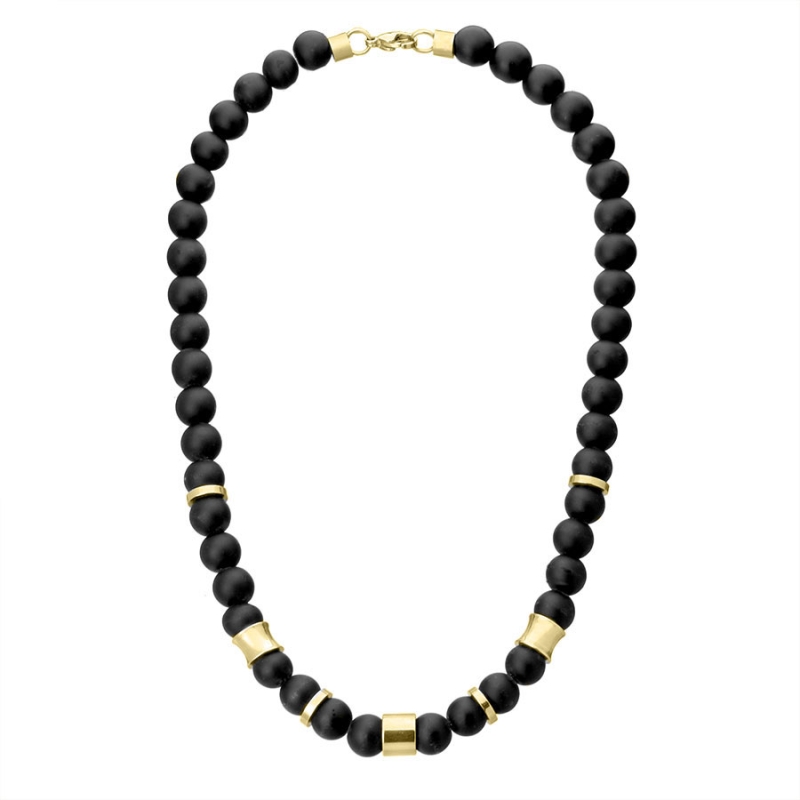 Ozdobte svůj krk tímto exkluzivním masivním pánským náhrdelníkem z kolekce značky Manoki. Nese název Joaquin a je složený z 10 mm černých Onyxů. Náhrdelníku dodávají šmrnc zlaté ocelové korálky. Délka náhrdelníku je 47 cm. K náhrdelníku nabízíme i náramek ze stejné kolekce. Náhrdelníky s korálky z přírodních kamenů a zlatých prvků jsou nesporným MUST HAVE hitem této sezóny, který musí být v šatníku každého znalce módy. Náhrdelník je skvělým doplňkem ke každodennímu outfitu pro muže, kteří mají rádi originální a designové doplňky. Noste jej samostatně nebo si vytvořte vlastní kompozici s dalšími korálkovými, koženými či ocelovými náhrdelníky. Vypadá opravdu skvěle, když se nosí s jinými náhrdelníky jako vrstvený náhrdelník. Náhrdelník dá šmrnc každému stylu: jak kanceláře, na procházku tak i na večer. Onyx - přírodní polodrahokam je ochranným kamenem proti kletbám a negativní energii. Odstraňuje negativní emoce z těla, chrání před zlem, čistí mysl, dodává vytrvalost a odvahu. Onyx pochází z řečtiny a znamená „dráp“. Onyx je kamenem válečníků a neúnavných cestovatelů. Tento minerál má obrovskou moc a majitel onyxových šperků se stává pánem svého osudu, dokáže ovládat své emoce a neúnavně se snaží dosáhnout svých cílů.