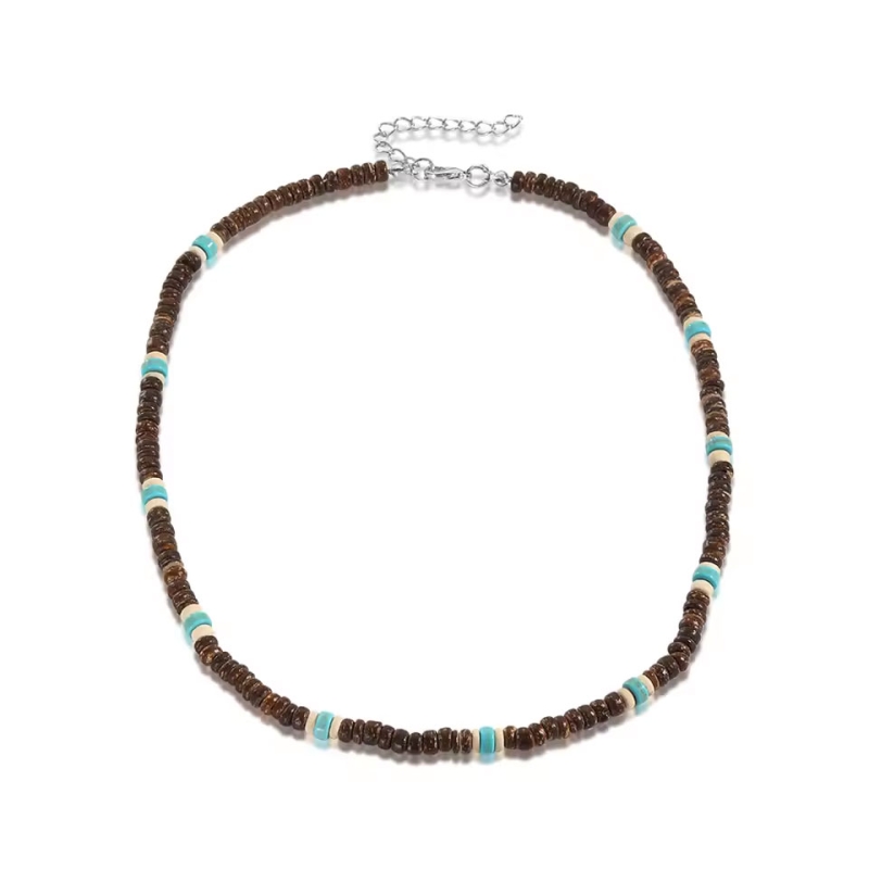 Pánský náhrdelník Koa je výrazným doplňkem s přírodním vzhledem, který v sobě spojuje sílu dřeva a svěžest oceánu. Dominantní tmavohnědé korálky připomínající kokosové dřevo kontrastují s tyrkysovými a krémovými prvky, čímž vytvářejí vyváženou kompozici s havajským nádechem. Díky nastavitelné délce perfektně sedí a působí přirozeně na každém krku.Tento styl náhrdelníků pochází z havajské kultury a byl populární zejména v 70. letech, ale také během 90. let a znovu se vrací do módy jako retro doplněk. Název Koa odkazuje na slavný havajský strom, jehož dřevo bylo tradičně používáno pro výrobu šperků, desek i kánoí – symbolizuje odvahu, pevnost a charakter.Náhrdelník Koa se skvěle hodí pro muže, kteří hledají autentický a stylový doplněk pro volnočasový nebo plážový outfit. Díky přírodním tónům a příjemnému tvaru se snadno kombinuje a zároveň poutá pozornost nenuceným, ale výrazným vzhledem. 💡Tip: Náhrdelník Koa vynikne v kombinaci s lněnou nebo džínovou košilí, případně jednoduchým tričkem. Doporučujeme sladit ho s koženým nebo dřevěným náramkem pro ještě výraznější přírodní styl.