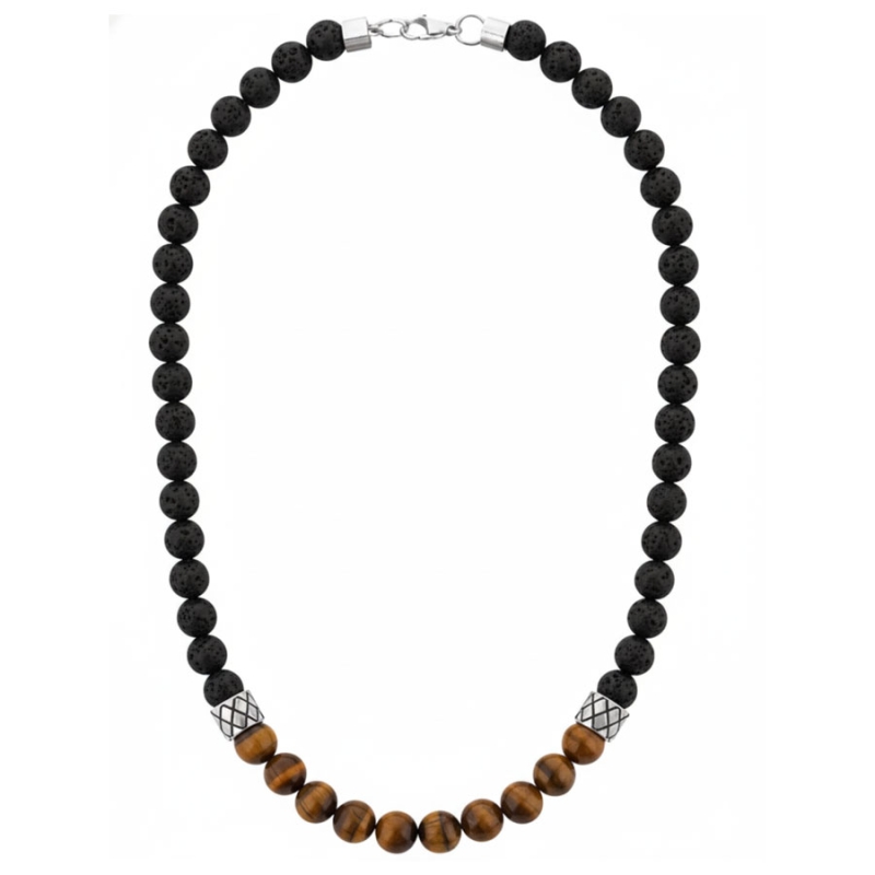 Luxusní pánský náhrdelník z kolekce Marco představuje harmonické spojení přírodních sil a mužného stylu. Kombinace černého lávového kamene a hnědého tygřího oka vytváří šperk, který vyzařuje sílu, sebevědomí a vnitřní klid. Výrazná kresba tygřího oka evokuje pohled šelmy – ostrý, soustředěný a klidně rozhodný.Lávový kámen dodává náhrdelníku surový charakter, zatímco tygří oko přináší lesk, hloubku a eleganci. Oba kameny patří k nejoblíbenějším minerálům v pánském šperkařství – nejen pro svůj vzhled, ale i pro svou symboliku. Celkový dojem dotvářejí elegantní detaily z chirurgické oceli, které podtrhují luxusní zpracování.Náhrdelník je ideální volbou pro moderního muže, který chce dát najevo osobní styl bez přehnané zdobnosti. Hodí se jak pro každodenní nošení, tak jako výrazný doplněk na večerní akci. Kombinace černé a hnědé z něj činí univerzální šperk, který ladí s jakýmkoli outfitem. 💡 Tip: Zvolte kratší variantu jako choker pro stylový, přiléhavý vzhled – nebo delší délku pro volnější, elegantní dojem. K tomuto náhrdelníku si můžete pořídit i ladící náramek a vytvořit tak dokonale sladěný a stylový look. Náramek zakoupíte ZDE