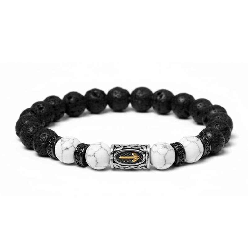 Pánský korálkový náramek spojuje přírodní sílu lávového kamene, harmonizující účinky bílého howlitu a mystickou energii runového symbolu ve zlatém provedení. Každý detail tohoto náramku odkazuje na pradávnou germánskou tradici, v níž runy symbolizovaly ochranu, odvahu a duchovní vedení. Díky svému nadčasovému vzhledu se stává výrazným doplňkem pro moderního muže, který hledá šperk s příběhem a smyslem. Bílý howlit se svou jemnou kresbou připomíná klid a vyrovnanost, zatímco lávový kámen, vzniklý z energie sopečné erupce, nese sílu země a odvahu překonávat překážky. Kombinace těchto kamenů tvoří harmonii mezi klidem a mocí – přesně tak, jak to muž potřebuje ve svém každodenním životě. Ocelový korálek se zlatou runou přináší do náramku prvek severské mytologie. Každý symbol runy má svůj význam – od ochrany přes vítězství až po sílu vůle. Náramek tak není jen estetickým doplňkem, ale také osobním amuletem, který může provázet muže na jeho životní cestě. Runu zasíláme náhodně, ale na přání rádi dodáme vámi zvolený symbol – napište nám jej do poznámky k objednávce. 💡 Tip: Zvolte runový symbol, který nejvíce vystihuje vaše hodnoty – například Tiwaz pro čest a odvahu, Fehu pro hojnost nebo Algiz pro ochranu. Náramek tak získá hlubší význam a osobní sílu.