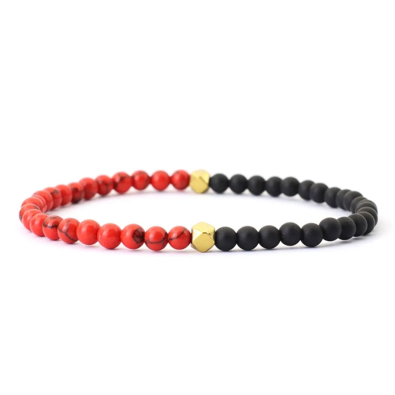 Stylový pánský náramek z černého achátu a červeného howlitu přináší harmonické spojení elegance a výrazného kontrastu. Díky decentnímu designu v kombinaci matných černých a sytě červených korálků se hodí ke každodennímu nošení i jako zajímavý doplněk k formálnějším outfitům.Zlaté akcenty v podobě lesklých hematitových korálků dodávají celku sofistikovaný nádech a jemný lesk. Korálky o průměru 4 mm jsou navlečeny na kvalitním pružném lanku, které zajišťuje pohodlné nošení a snadné nasazení bez zapínání.Univerzální velikost (délka 21 cm) je navržena tak, aby vyhovovala většině pánských zápěstí. Tento náramek ocení každý muž, který má smysl pro styl a originalitu v detailech. 💡Tip: Skvělý jako dárek pro partnera, bratra nebo kamaráda – výrazný doplněk, který vyjádří osobitý vkus a zároveň neztratí univerzální eleganci.