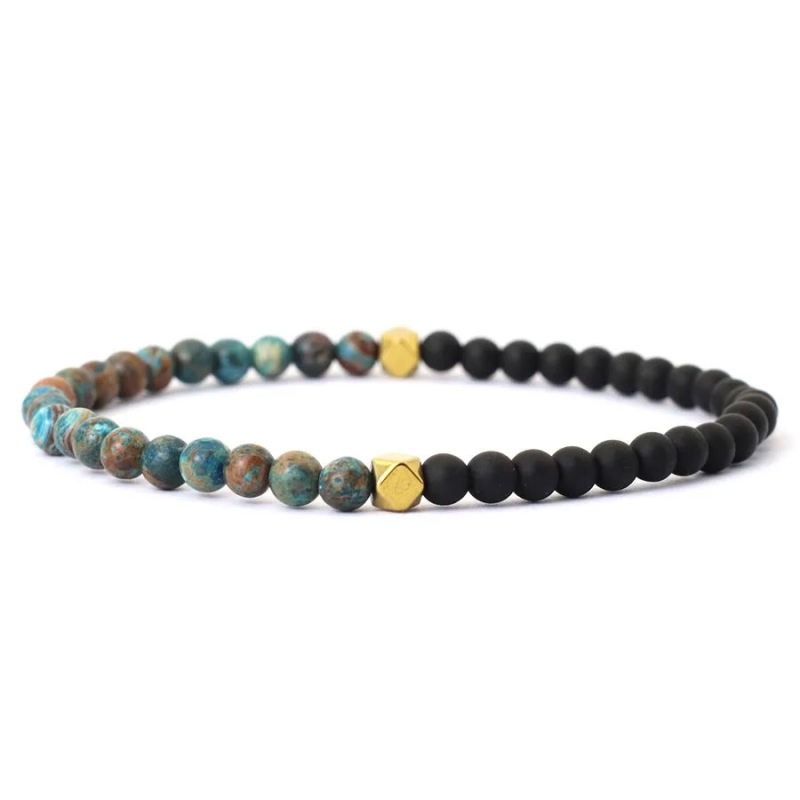 Tento stylový pánský náramek kombinuje matný černý achát, zemité tóny přírodního jaspisu a elegantní zlaté prvky z hematitu. Výrazná barevnost jaspisových korálků s modrozelenými a hnědými nuancemi připomíná přírodní krajinu a dodává náramku osobitý charakter. Vše je doplněno o decentní zlaté detaily, které z náramku dělají moderní a přesto nadčasový doplněk.Minerální korálky o průměru 4 mm jsou navlečeny na pružném lanku o délce 21 cm, což zajišťuje pohodlné nošení pro většinu pánských zápěstí. Náramek je lehký, nenápadný a zároveň poutavý – ideální pro muže, kteří si potrpí na detaily a kvalitu zpracování.Barevná kombinace černé a přírodně zbarvené části působí harmonicky a svěže. Náramek se snadno kombinuje s casual i formálním oblečením a je ideální volbou pro každodenní nošení i jako výraznější stylový akcent. 💡Tip: Tento pánský náramek z jaspisu krásně ladí s přírodními tóny oblečení – zkuste jej nosit s béžovou, olivově zelenou nebo denimem pro autentický přírodní look.