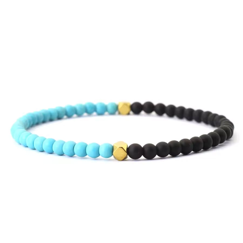 Elegantní pánský náramek Ewson zaujme moderním spojením přírodních kamenů a minimalistického designu. Kombinace matného achátu, tyrkysově zbarveného howlitu a lesklých korálků ze zlatého hematitu vytváří harmonický celek, který podtrhuje mužskou individualitu. Průměr korálků 4 mm zajišťuje jemný, ale zároveň dostatečně výrazný vzhled.Náramek je navlečen na kvalitním elastickém lanku o délce 21 cm, díky čemuž pohodlně padne na většinu pánských zápěstí. Pečlivě vybrané kameny nejen dobře vypadají, ale jsou i příjemné na dotek, což z něj činí ideální doplněk pro každodenní nošení. Skvěle se hodí jak k ležérnímu, tak i elegantnějšímu outfitu.Tento náramek je nejen stylovým módním doplňkem, ale také způsobem, jak vyjádřit svůj osobitý vkus. Díky přírodním materiálům a zlatému detailu působí sofistikovaně, aniž by působil okázale. Každý korálek je originál – stejně jako muž, který ho nosí. 💡Tip: Hledáte decentní, ale výjimečný dárek pro muže? Tento náramek s kombinací tyrkysového howlitu, achátu a zlatého hematitu potěší každého, kdo má smysl pro detail, kvalitu a eleganci.