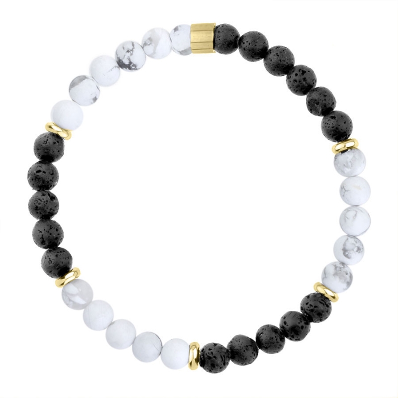 Spojení síly, klidu a elegance – to představuje pánský náramek z 6mm korálků bílého howlitu a černého lávového kamene. Doplňky z pozlacené chirurgické oceli dodávají šperku luxusní nádech, který z něj činí ideální doplněk pro muže s osobitým stylem.Howlit, kámen vnitřního míru, kontrastuje s lávovým kamenem, symbolem odvahy a síly. Společně vytvářejí harmonii mezi rozvahou a energií, mezi klidem a vášní. Každý korálek byl pečlivě vybroušen, aby vynikl jeho přirozený charakter a autentická struktura.Náramek se hodí jak k ležérní košili, tak k formálnímu outfitu. Díky pružnému lanku se pohodlně přizpůsobí zápěstí a můžete ho nosit samostatně nebo v kombinaci s dalšími pánskými náramky pro vrstvený efekt. 💡 Tip: Pokud rádi vrstvíte doplňky, zkuste náramek nosit společně s ocelovým řetízkem nebo druhým minerálním náramkem v podobných tónech. Kombinace více přírodních kamenů působí silně, autenticky a podtrhuje mužský charakter. Ideální volba pro muže, kteří se nebojí projevit svůj osobitý styl.