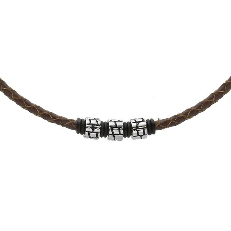 Stylový pánský náhrdelník Lewis z přírodní kůže a chirurgické oceli nadchne každého muže, který má v oblibě netradiční módní doplňky. Náhrdelník tvoří proplétaná hnědá kožená tkanička a na ní se nachází ocelové a kožené kroužky. Díky svému symetrickému tvaru je symbolem klidu, pohody a vnitřní harmonie.