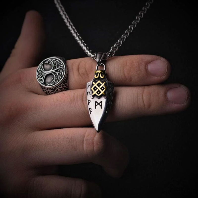 Vstupte do světa severské mystiky s tímto pánským ocelovým náhrdelníkem. Přívěsek ve tvaru Ódinova kopí GUNGNIRu je nejen symbolickým vyjádřením síly a ochrany, ale také skrývá další tajemství. Oboustranný design přívěsku vám umožňuje nosit jej podle své nálady a stylu. Na každé straně je zobrazen jiný zlatý symbol a jsou na něm vyryté runy, starobylé symboly, které nosí významy a energii severského dědictví. Tyto runy mají moc propojit vás se starověkou moudrostí a přinést vám štěstí a sílu do každodenního života. Tento pánský ocelový náhrdelník je vyroben z kvalitní chirurgické oceli, která zajišťuje jeho trvanlivost a odolnost. Kombinace Ódinova kopí, run a precizního zpracování tvoří z tohoto náhrdelníku jedinečný klenot pro muže, kteří hledají spojení se severskou kulturou a jejími symboly. Je to nejen výrazný a stylový doplněk, ale také silný symbol vaší síly a jedinečnosti.
