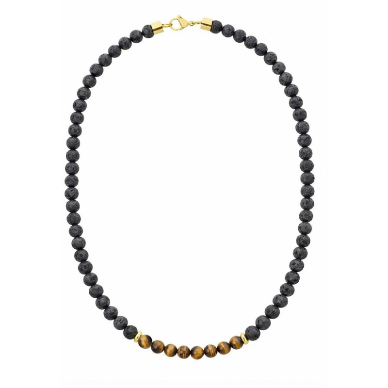Tento pánský náhrdelník spojuje sílu přírodních materiálů s moderním designem a vytváří výrazný doplněk pro muže, kteří vědí, co chtějí. Dominantní 8mm korálky z lávového kamene zaujmou svou syrovou texturou a hlubokým matným odstínem, zatímco tygří oko v přední části přináší teplý kontrast a elegantní akcent. Celek je doplněn prvky z chirurgické oceli ve zlatém tónu, které dodávají šperku luxusní a současný vzhled.Lávový kámen působí přirozeně, autenticky a lehce drsně, což z něj činí ideální materiál pro pánské šperky s charakterem. V kombinaci s tygřím okem vzniká harmonický celek, který nepůsobí přeplácaně, ale má jasný stylový směr. Náhrdelník tak skvěle doplní jak ležérní outfit, tak i promyšlenější městský look s důrazem na detail.Proč si vybrat právě tento náhrdelník? Protože představuje luxusní must-have doplněk letošní sezóny, který kombinuje trendy přírodní materiály, mužnou estetiku a nadčasový design. Je to šperk pro opravdové muže, kteří chtějí vyjádřit svou osobnost bez zbytečné okázalosti. 💡 Tip: Skvěle ladí s přírodními tóny – béžovou, hnědou, khaki, černou nebo šedou. Právě v těchto kombinacích působí nejpřirozeněji a nejstylověji.