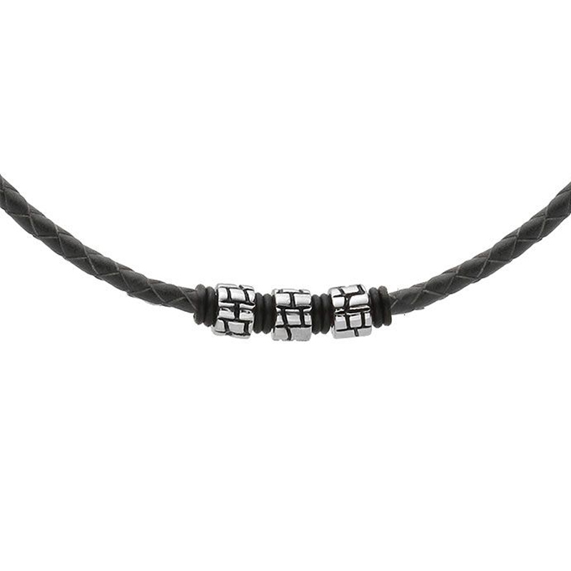 Stylový pánský náhrdelník z přírodní kůže a chirurgické oceli nadchne každého muže, který má v oblibě netradiční módní doplňky. Náhrdelník tvoří jednoduchá kožená tkanička a na ní se nachází ocelové a kožené kroužky. Díky svému symetrickému tvaru je symbolem klidu, pohody a vnitřní harmonie.