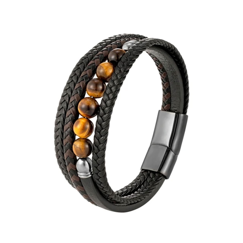 Tento moderní pánský náramek je kombinací přírodních prvků a stylového designu. Kožené pásky v černé i hnědé barvě dodávají náramku elegantní vzhled, zatímco přidané korálky z tygřího oka přinášejí nádech tajemství a síly. Tygří oko je známé svou ochranou energií a schopností posilovat sebevědomí, což dělá z tohoto náramku nejen módní doplněk, ale i symbol osobní síly. Detailní pletené vzory kůže přinášejí sofistikovaný kontrast k hladkým povrchům korálků a vytvářejí dynamický vzhled, který se hodí k jakémukoli outfitu. Náramek je opatřen černou magnetickou sponou, která zajišťuje bezpečné a pohodlné nošení a zároveň usnadňuje jeho nasazování. Tento náramek je ideální volbou pro moderního muže, který hledá elegantní a zároveň silný doplněk. Kombinace kůže a kamene je nejen nadčasová, ale také univerzální, takže tento kousek skvěle podtrhne váš osobitý styl.