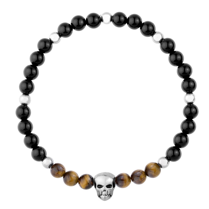 Stylový pánský náramek s lebkou je dokonalou kombinací elegance, síly a individuality. Jeho design tvoří 6mm lesklé korálky z černého onyxu, které dodávají šperku tajemný a nadčasový vzhled, a korálky z tygřího oka, známého svou zlatohnědou hrou barev. Dominantním prvkem je detailně propracovaná ocelová lebka, která podtrhuje drsný, rebelský charakter náramku.Díky pružnému provedení se náramek snadno přizpůsobí zápěstí a je pohodlný na nošení po celý den. Hodí se k ležérnímu i elegantnímu stylu a skvěle doplní například kožený náramek nebo ocelový řetízek. Náramek je ideální volbou pro muže, kteří si potrpí na výrazné a symbolické doplňky. 💡Tip: Tento náramek je skvělým dárkem pro muže, kteří mají rádi moderní a stylové doplňky s osobitým charakterem. Hodí se k narozeninám, svátku nebo jako dárek pro milovníky motorkářského a rockového stylu.