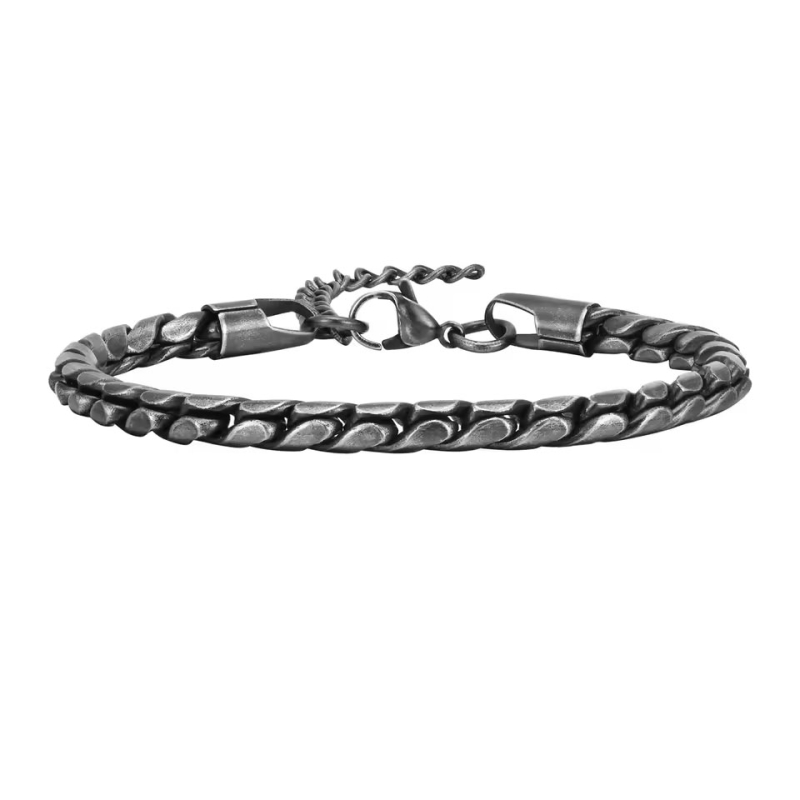 Tento pánský náramek z chirurgické oceli vyniká výrazným vintage vzhledem, který podtrhuje jeho charakter a nadčasový styl. Masivnější pletený řetízek o šířce 5 mm působí pevně, mužně a elegantně zároveň. Jemně ztmavený kov dodává náramku industriální atmosféru, díky níž perfektně zapadne k modernímu streetwearu i casual outfitu. Díky délce 18 cm a prodloužení o dalších 5 cm nabízí pohodlné nošení i možnost přizpůsobení.Každý detail byl navržen tak, aby šperk působil autenticky, ale zároveň nadčasově. Prodloužený řetízek lze využít nejen ke zvětšení obvodu, ale také jako efektní dekorativní prvek, který podtrhne osobitý styl nositele. Tento náramek je ideální volbou pro muže, kteří preferují neokoukané, kvalitní a výrazné doplňky z odolných materiálů. 💡 Tip: Skvěle se hodí k tmavému oblečení, koženým bundám i jednoduchým tričkům. Stačí jeden šperk, aby outfit získal sebevědomý a moderní charakter.