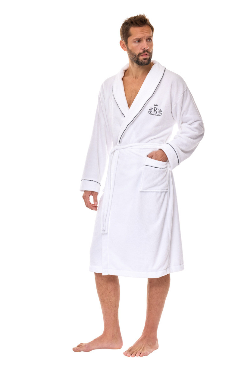 Szlafrok męski 2523 to synonim luksusu i wygody dla mężczyzn ceniących elegancki styl nawet w domowym zaciszu. Wykonany z wysokiej jakości tkaniny będącej połączeniem naturalnego bambusa i bawełny, zapewnia nie tylko miękkość, ale też doskonałą oddychalność oraz właściwości antybakteryjne. Klasyczny krój z kołnierzem szalowym, wykończenia z kontrastową lamówką i haftowane logo nadają mu wyjątkowego charakteru. Szlafrok wyposażono w praktyczne kieszenie i pasek w talii. Dostępny w dwóch kolorach: elegancka biel i stylowy granat. Skład: 60% Bambus, 40% Bawełna