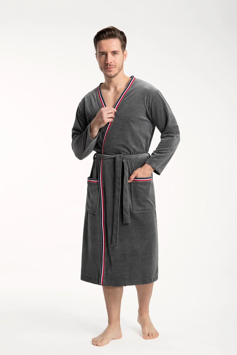 Pánský župan Luna s dlouhými rukávy a barevnými záhyby, zavazování na pásek, s kapsami, délka do půli lýtek. Složení: velur: 80 % bavlna, 20 % polyester