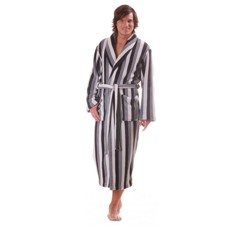 Pánský hřejivý župan - šedé pruhy. Úspěšná kolekce pánských hřejivých županů z materiálu coral fleece. Svěží, jasné odstíny královské modré a tlumené tóny kouřově šedé nabízí možnost volby pro klidnější i akční povahy. Klasická délka a pohodlný střih se šálovým límcem a dvěma kapsami.