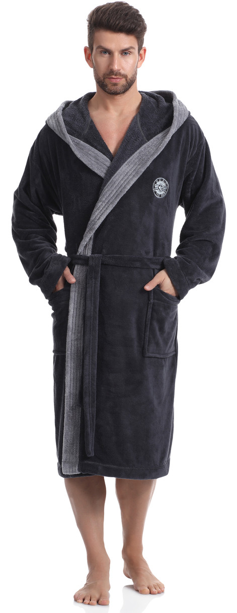 Pánský župan, který je vyrobený z tkaniny typu "soft". Župan má kapuci a zavazuje se v pase. Na hrudníku je našitá aplikace. Složení: 100 % polyester.