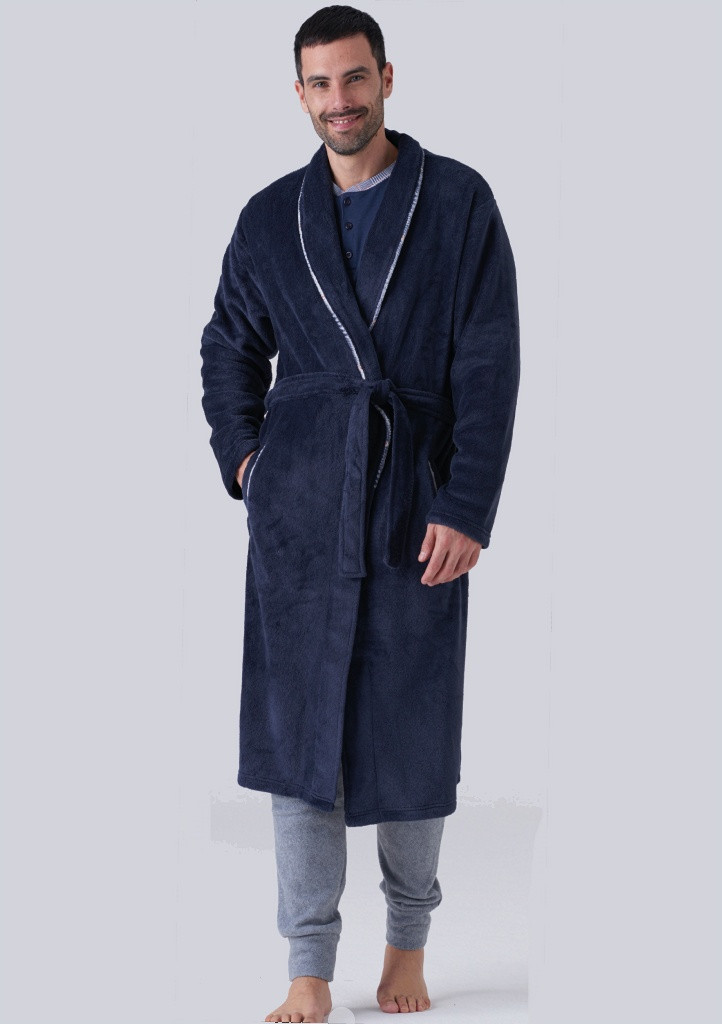 Hřejivý pánský župan od značky Karelpiu. Župan má šálový límec a v pase je na utažení páskem. Délka sahá pod kolena. Po stranách má dvě kapsy. Límec a kapsy jsou olemovány barevným páskem. Materiálové složení: 100% polyester